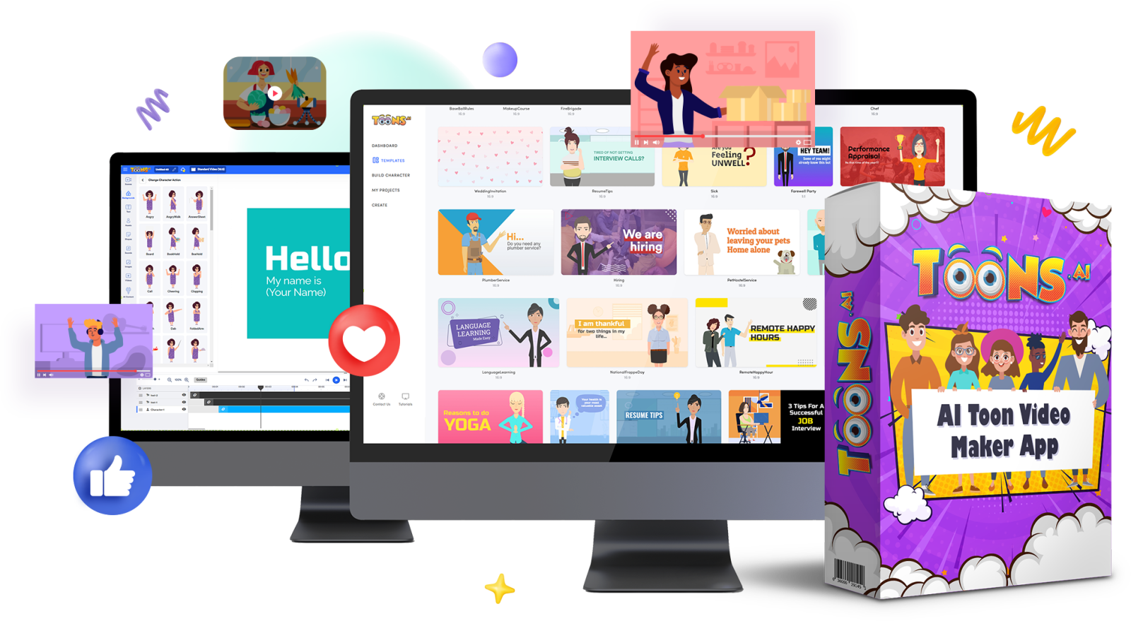AI Toons Character Builder, Avatar Customization Engine, 40 Actions Per Character, 100's of Ready-Made Video Templates, Full Feature Timeline Video Editor, AI Video Script Writing Robot, Millions of Copyright-Free Toon Assets, Realistic Text-To-Speech Voices, Unlimited Videos Forever and so much more!